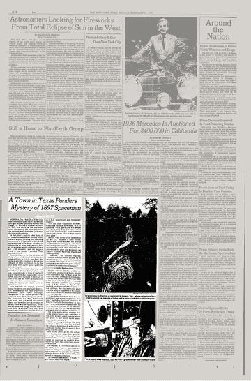 One of these reports was published in the Dallas Morning News on April 19, 1897. Aurora resident S. E. Haydon wrote that two days earlier, around 6:00 AM Central time, a strange craft struck a windmill on the property of Judge J. S. Proctor and crashed. The pilot, described by a reported Army officer from nearby Fort Worth as a being “not of this world” and a “Martian,” died in the impact. The townspeople were said to have buried the body “with Christian rites” in the Aurora Cemetery, which today has a Texas Historical Commission marker referencing the incident. Why was this buried on page 5?